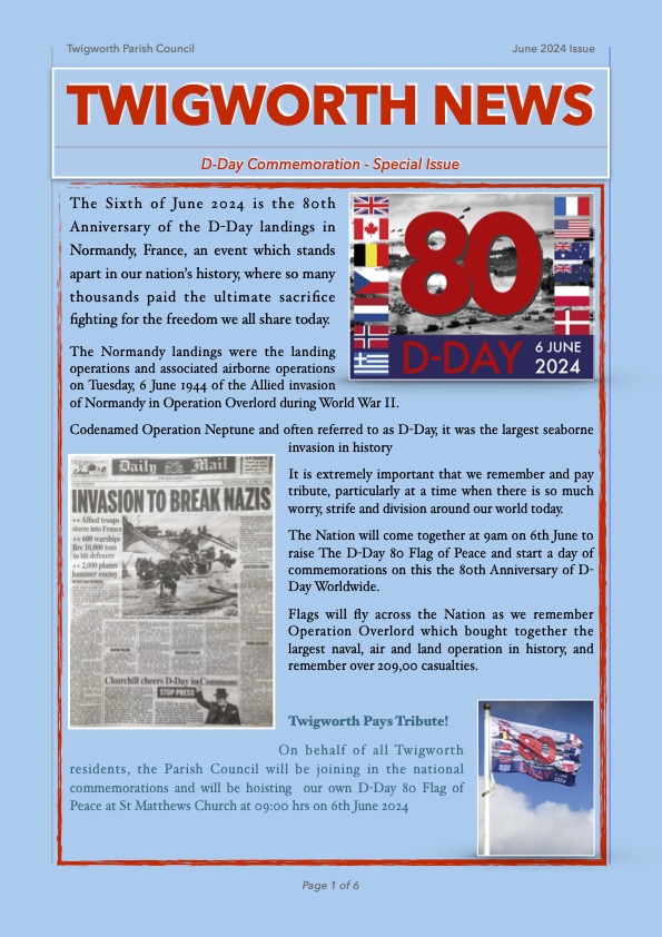 On behalf of all Twigworth residents, the Parish Council will be joining in the national commemorations and will be hoisting our own D-Day 80 Flag of Peace at St Matthews Church at 09:00 hrs on 6th June 2024