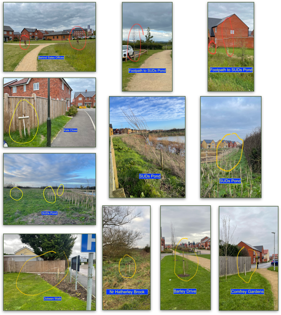 Following the winter storms, there has been much damage to the saplings around Twigworth Green, those in photos have been reported both to Vistry and Gateway Management.
