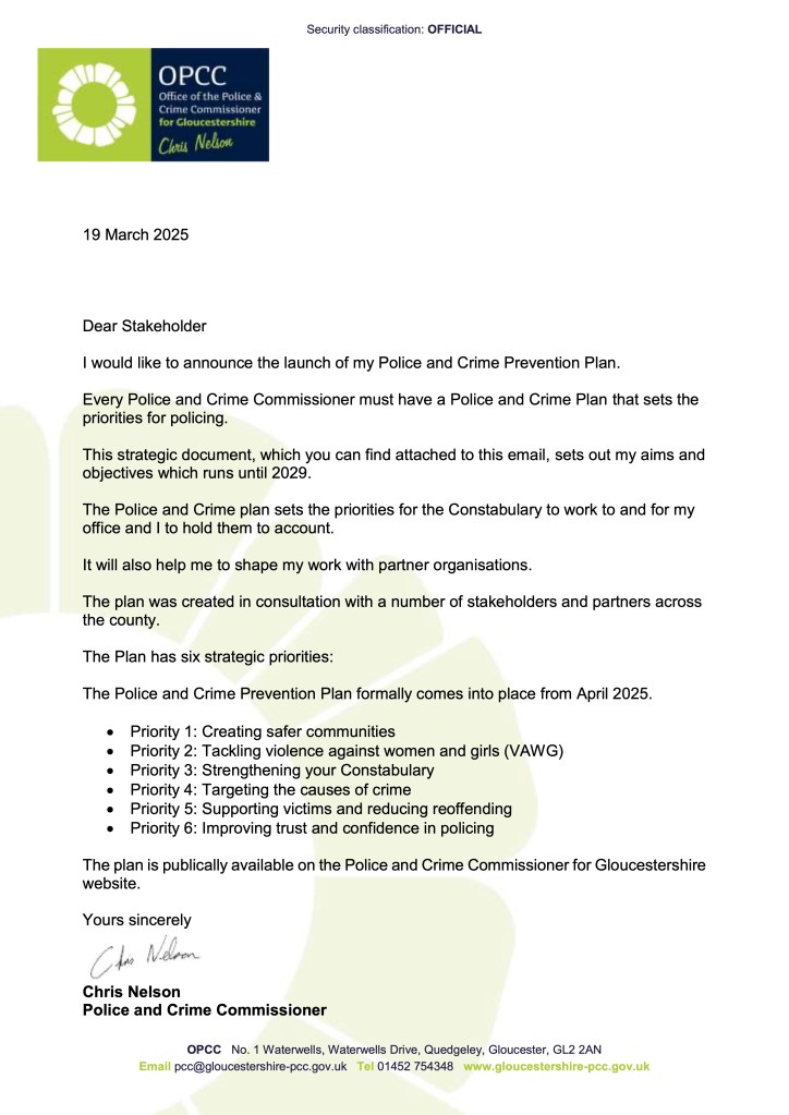 Please find attached the Police and Crime Prevention Plan for 2025 to 2029 as well as the Stakeholder letter.