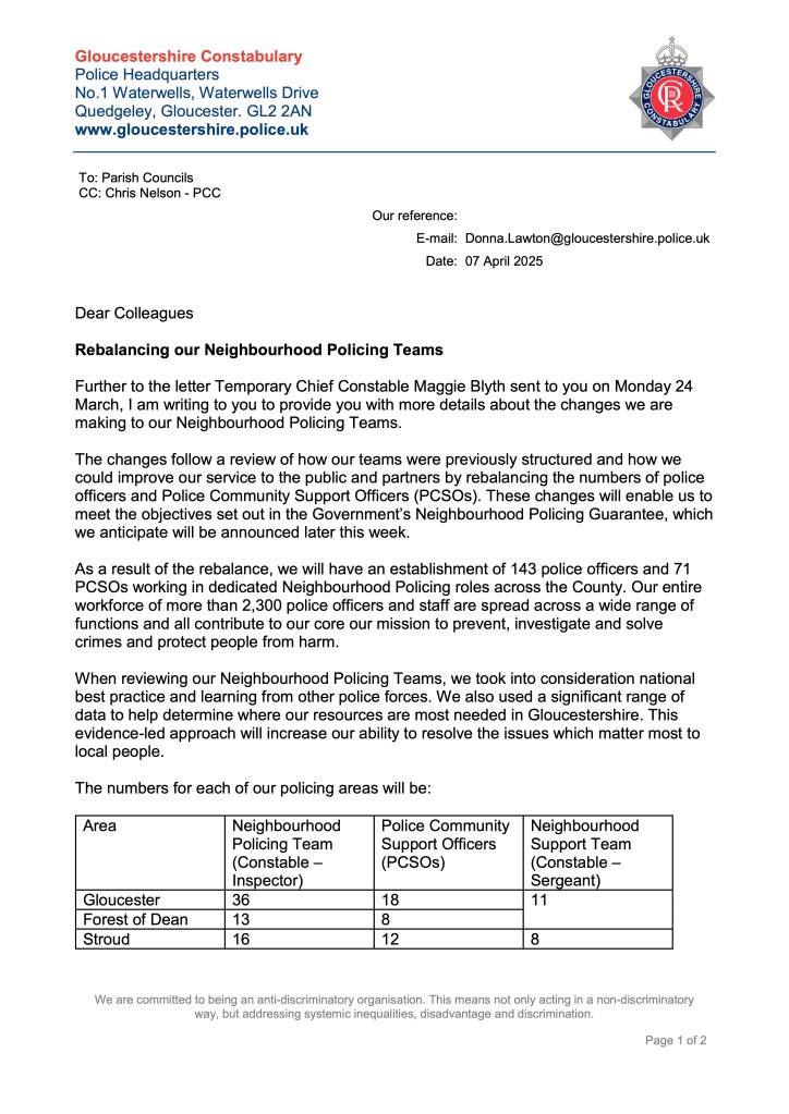 Attached, is a letter that was sent to Parish Councils from Gloucestershire Constabulary from Assistant Chief Constable Donna Lawton regarding our Neighbourhood Policing rebalance.