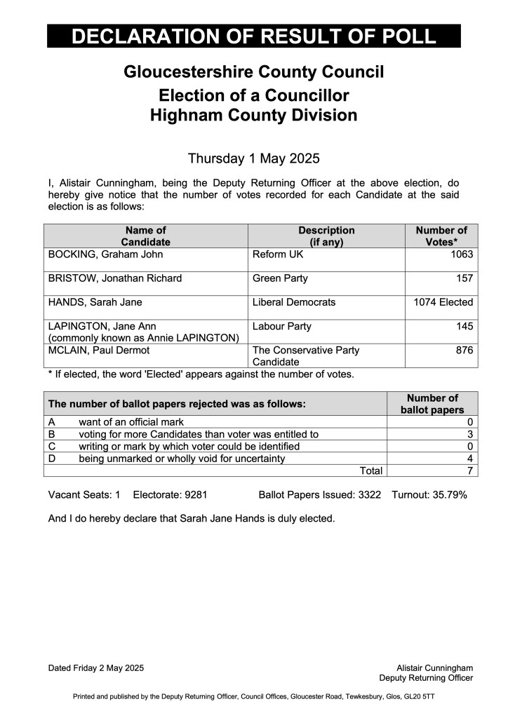 Sarah Jane Hands (Lib Dem) has been elected as a county councillor with 1,074 votes.