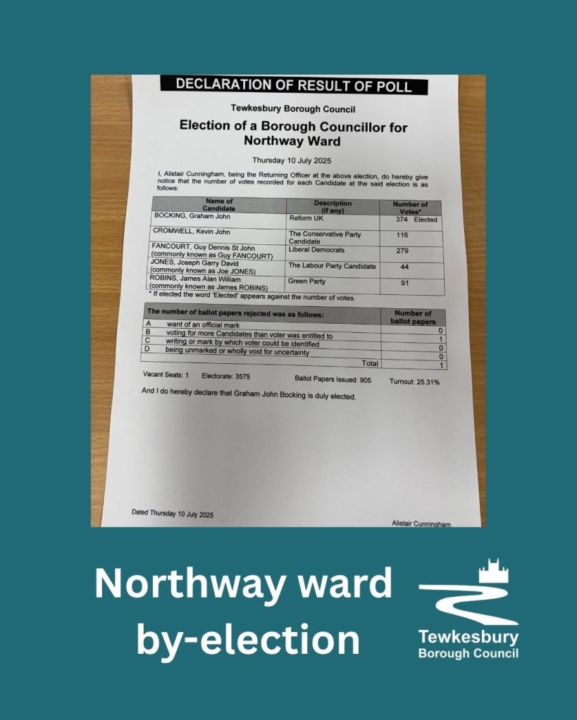The candidate Graham John Bocking, Reform UK has been elected as the Borough Councillor for the Northway ward with 374 votes.