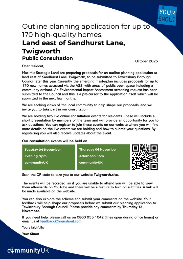 Parish Councillors have been advised that consultation has started for outline planning application, proposing up to 170 high-quality homes, new areas of public open space and the potential for a community facility, accessed via the A38, at land east of Sandhurst Lane, Twigworth.