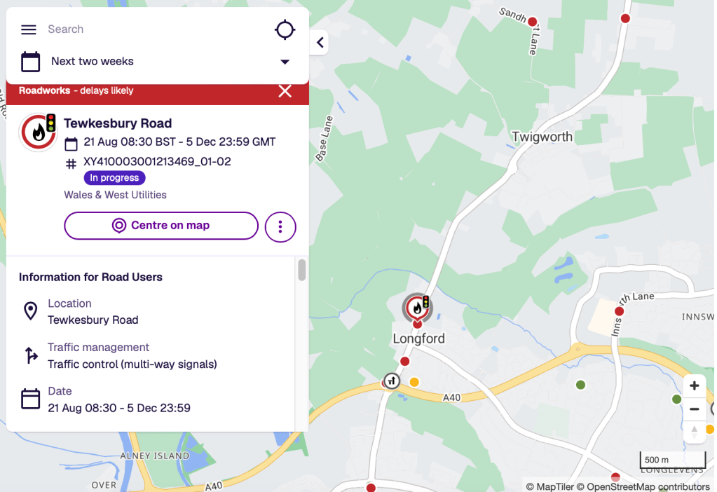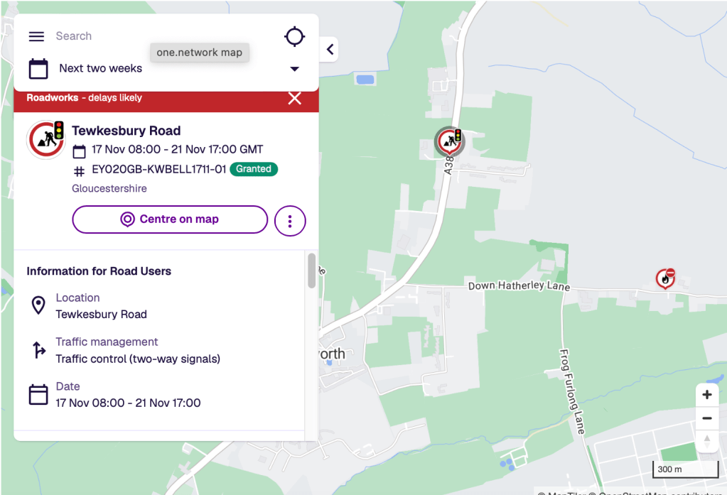New roadworks on A38 Tewkesbury Road (North of Down Hatherley Lane) starting 17 November until 21 November
