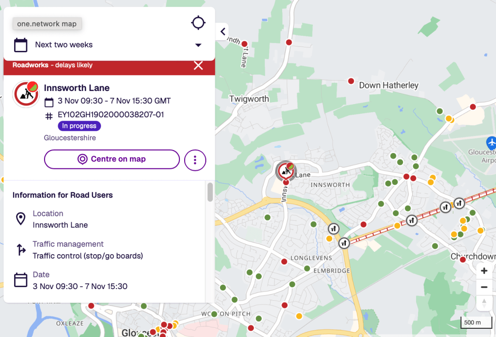 New roadworks on Down Hatherley Lane starting 10 November 2025 for 10 weeks until 28 January 2026