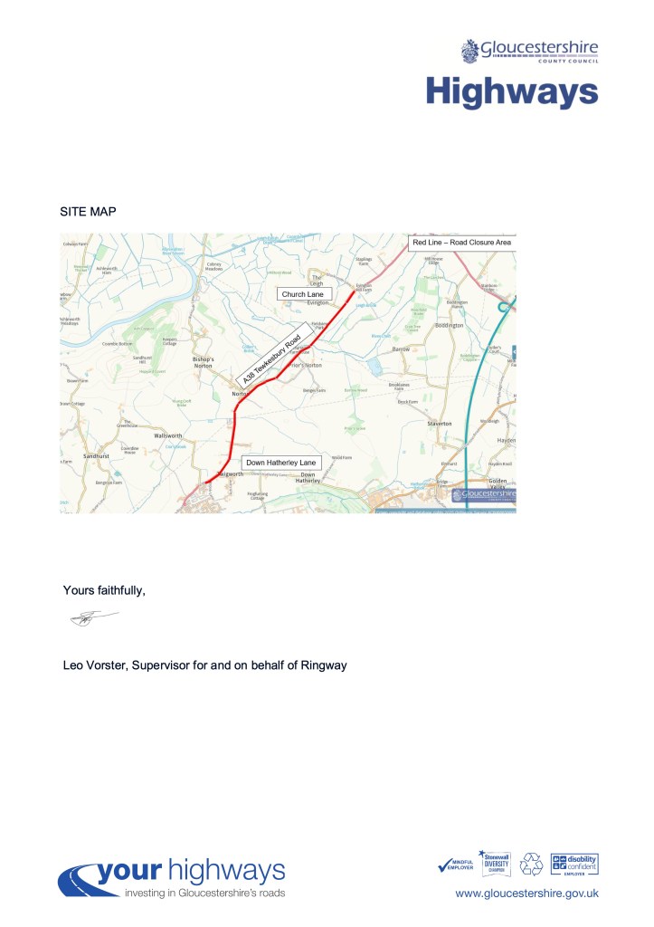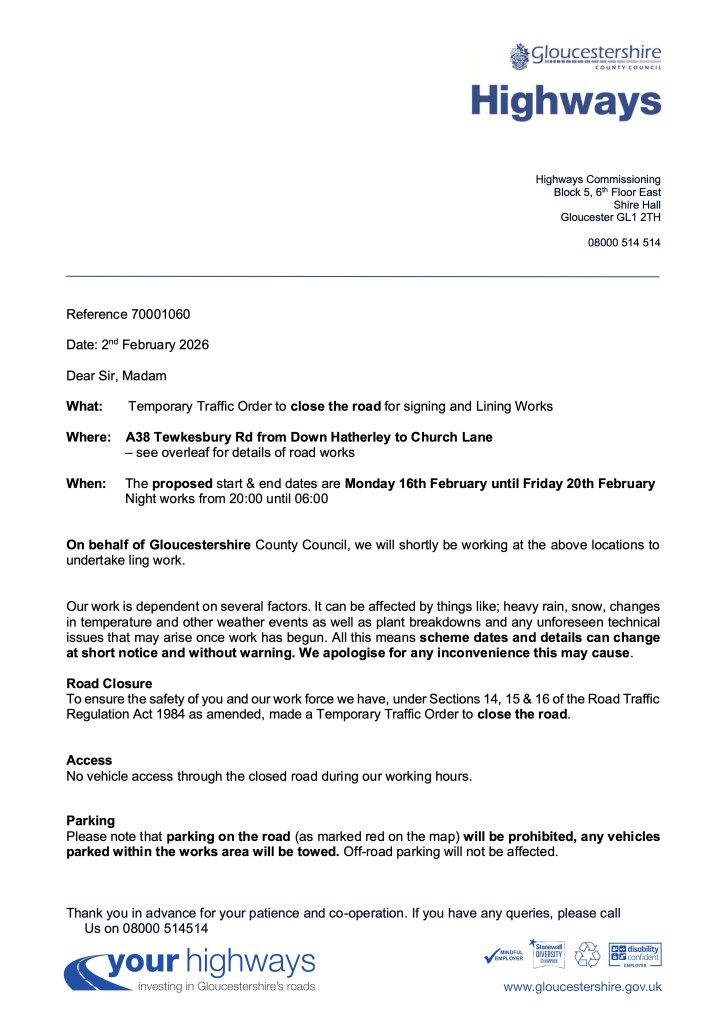 This Traffic Order affects the roads within the Parishes of Twigworth, Down Hatherley, Norton and Leigh and comes into operation on the 6th February 2026