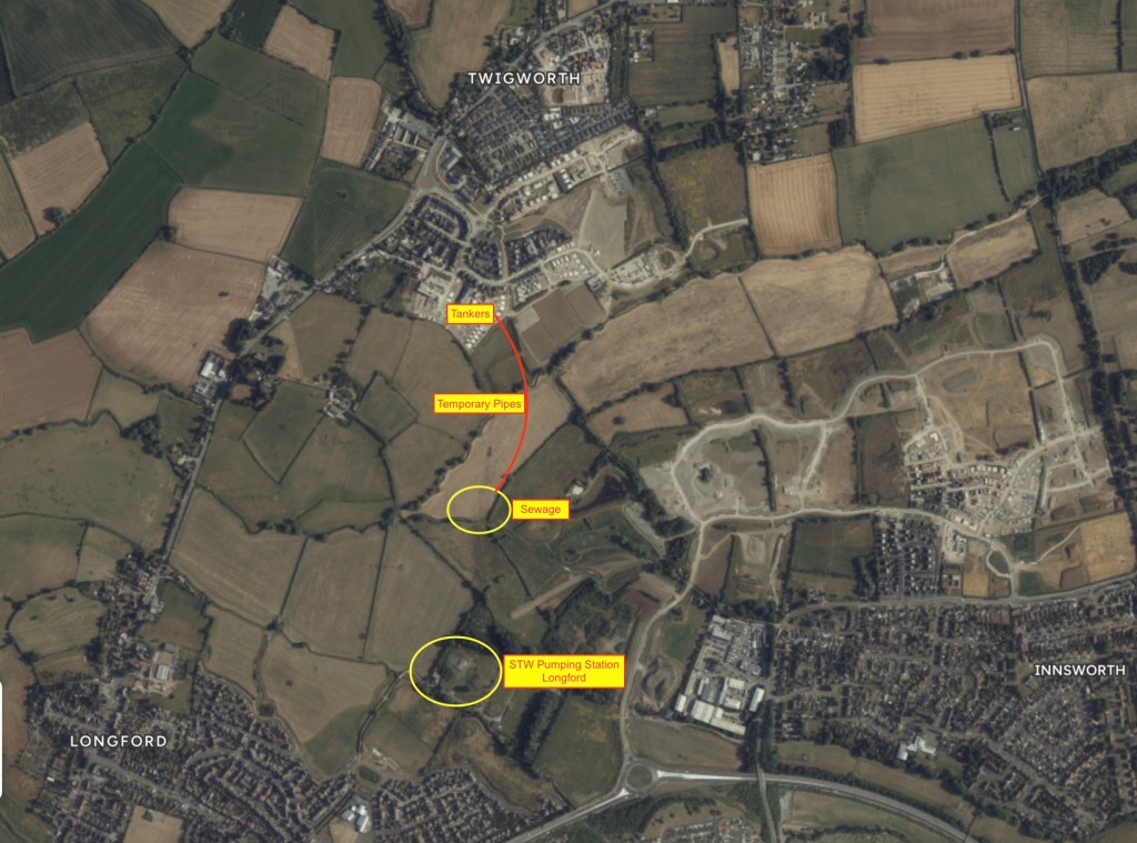 “By way of a brief summary, Vistry (Twigworth Green Developer)  were made aware of an issue initially in the location roughly in the location where Vistry and Taylor Wimpey (Innsworth Developer) sewers meet and the Severn Trent Water (STW) requisition sewer then takes flows to the Longford Pumping Station.