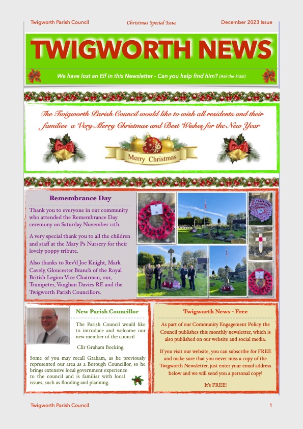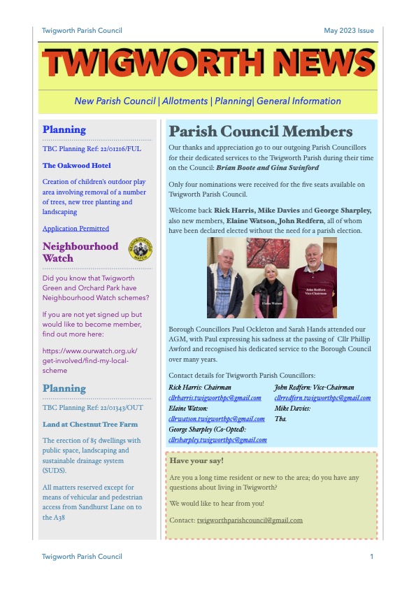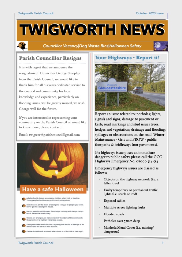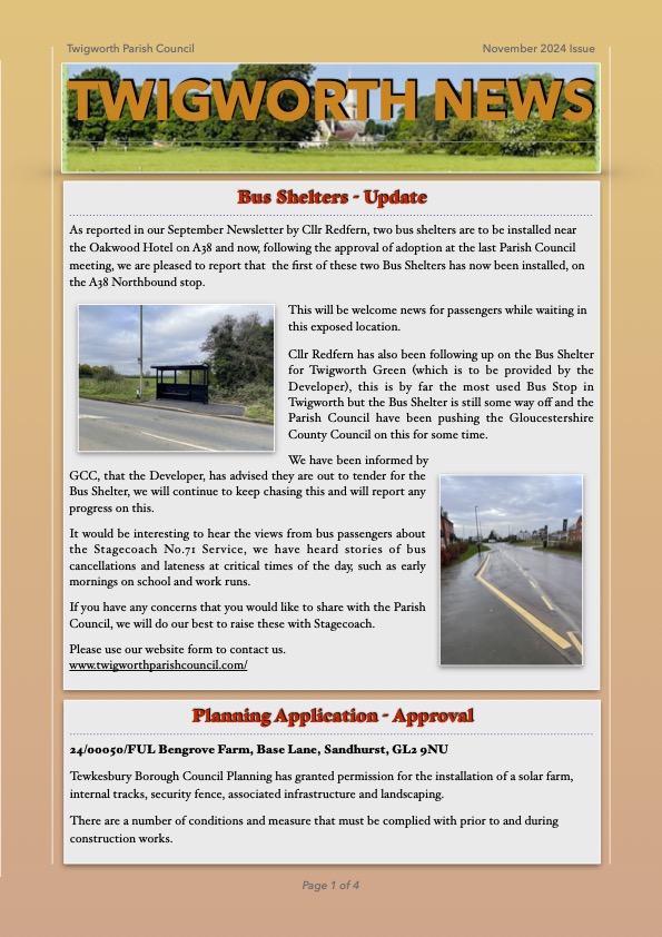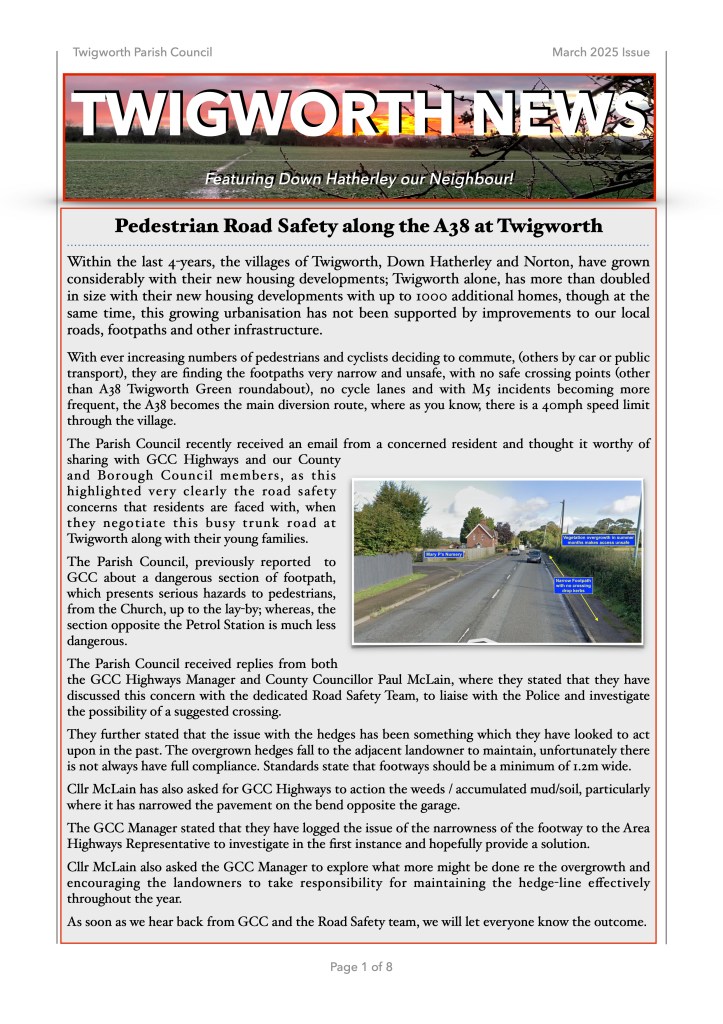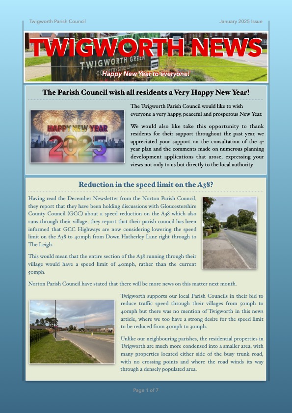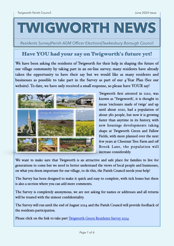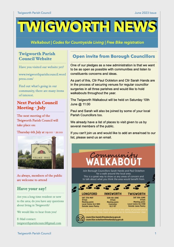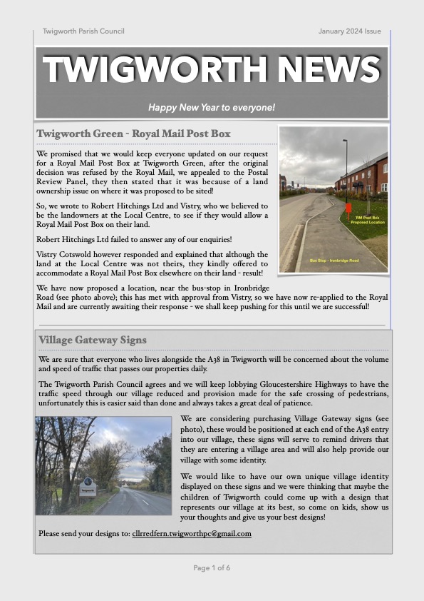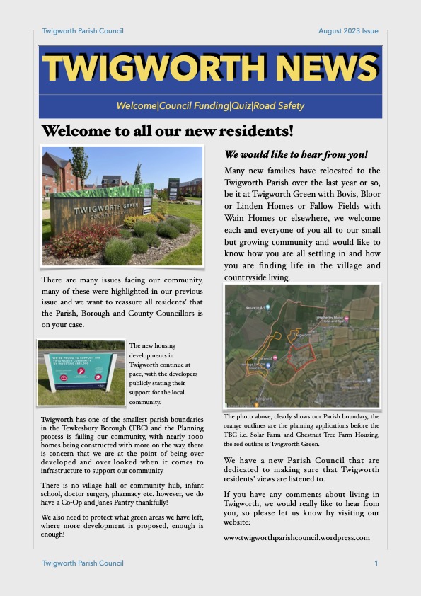 As part of our Community Engagement Policy, the council publishes a monthly newsletter, the Twigworth News, which is published online and on social media.