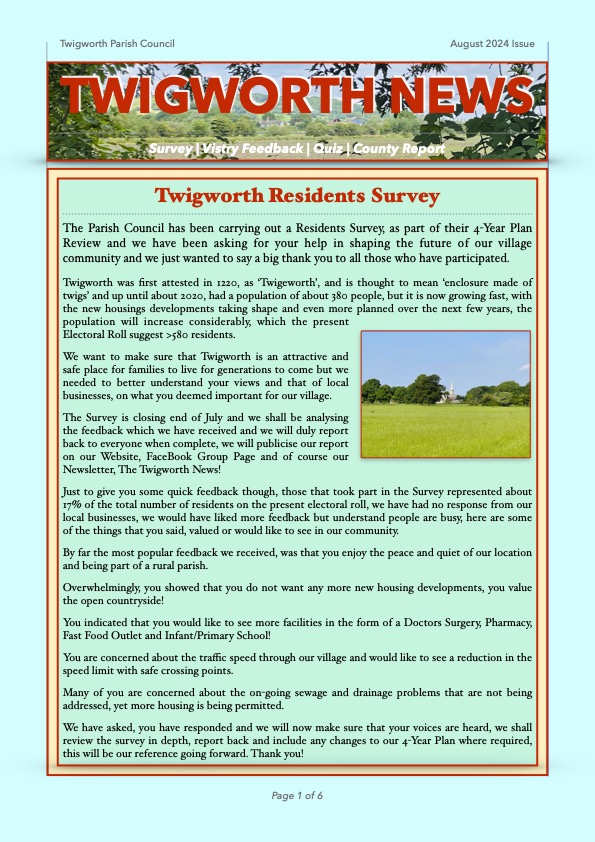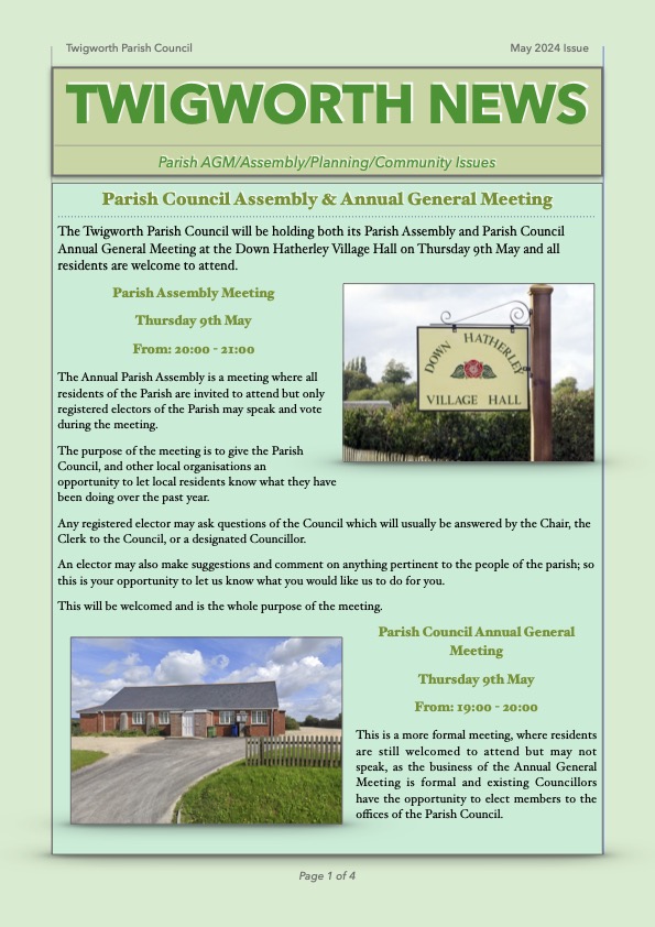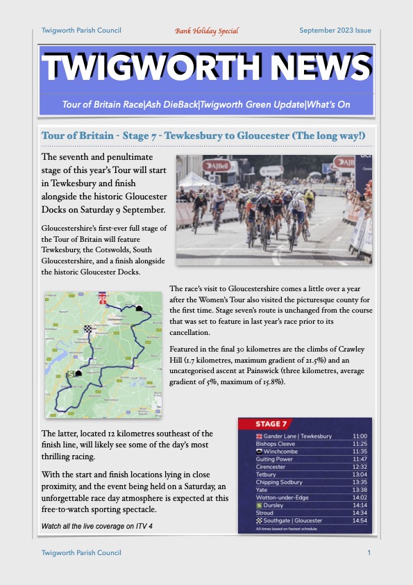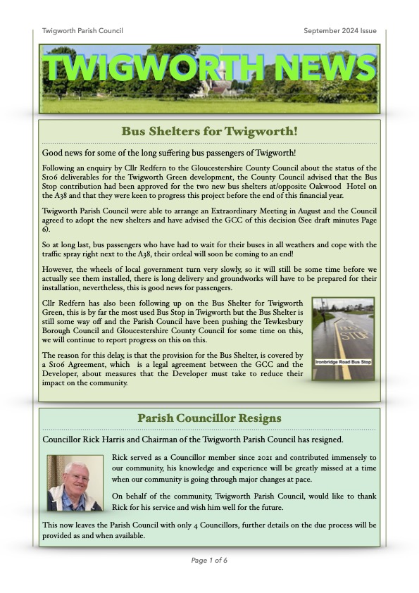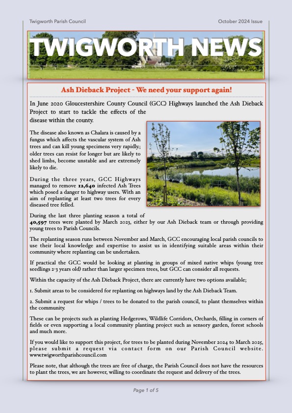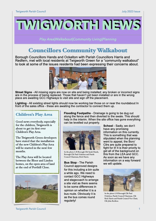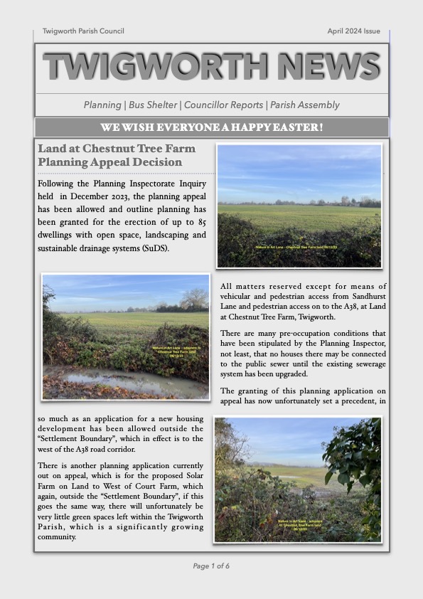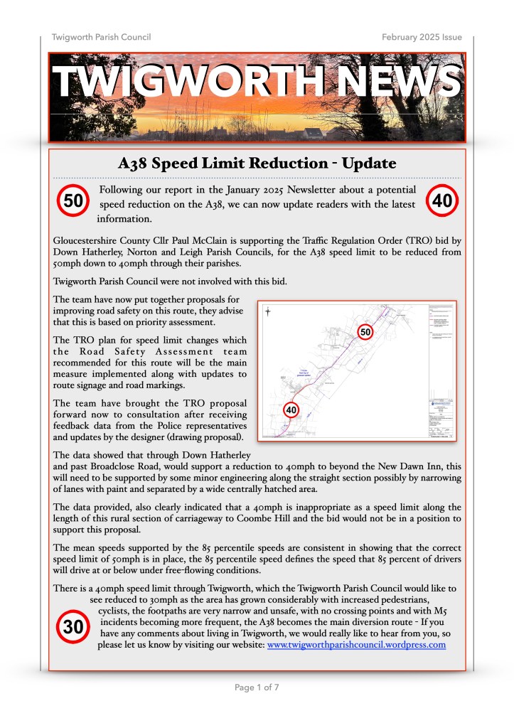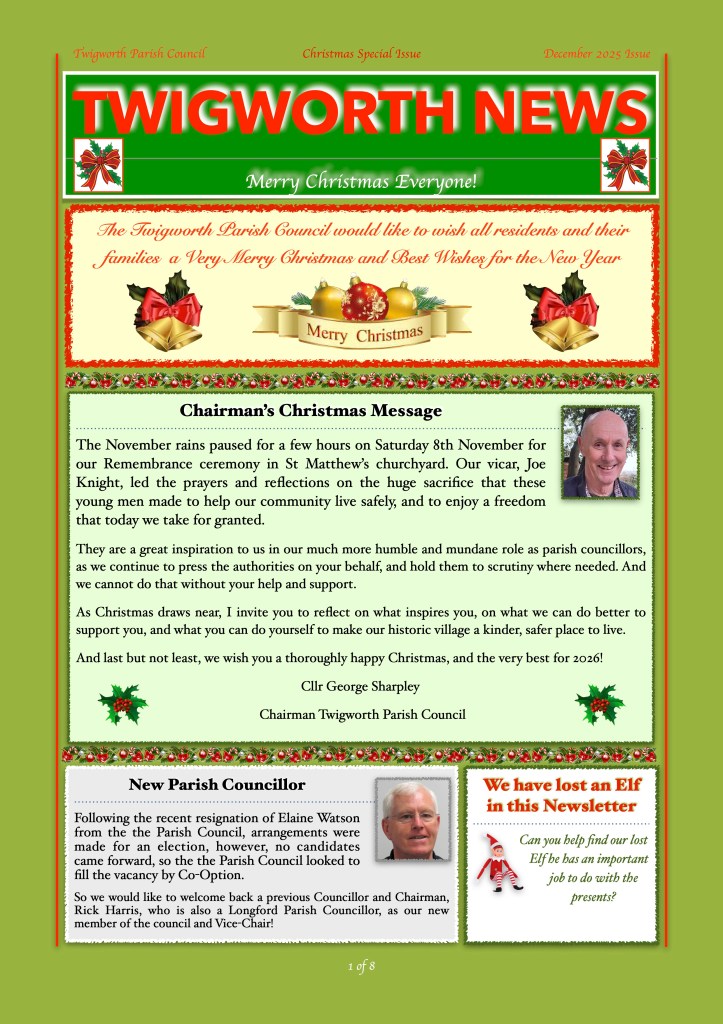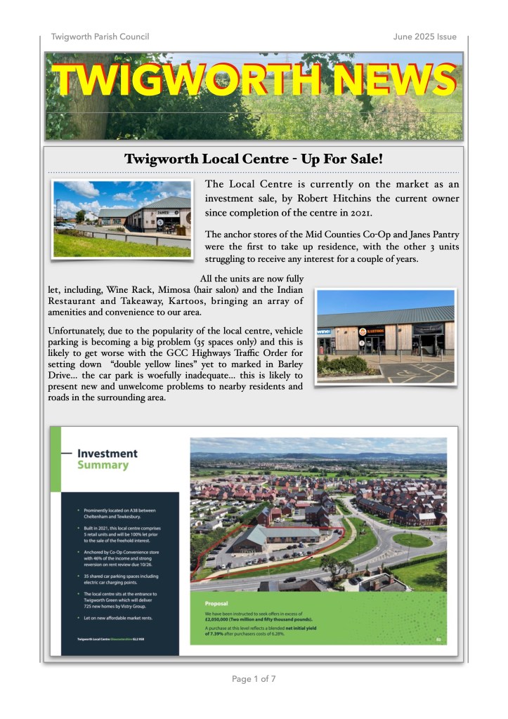 As part of our Community Engagement Policy, the council publishes a monthly newsletter, the Twigworth News, which is published online and on social media.