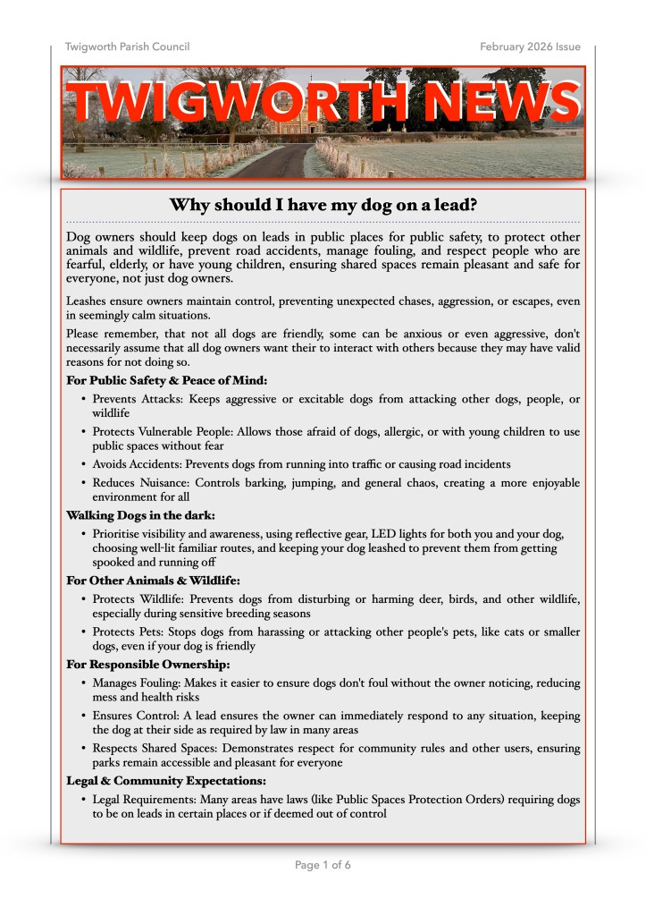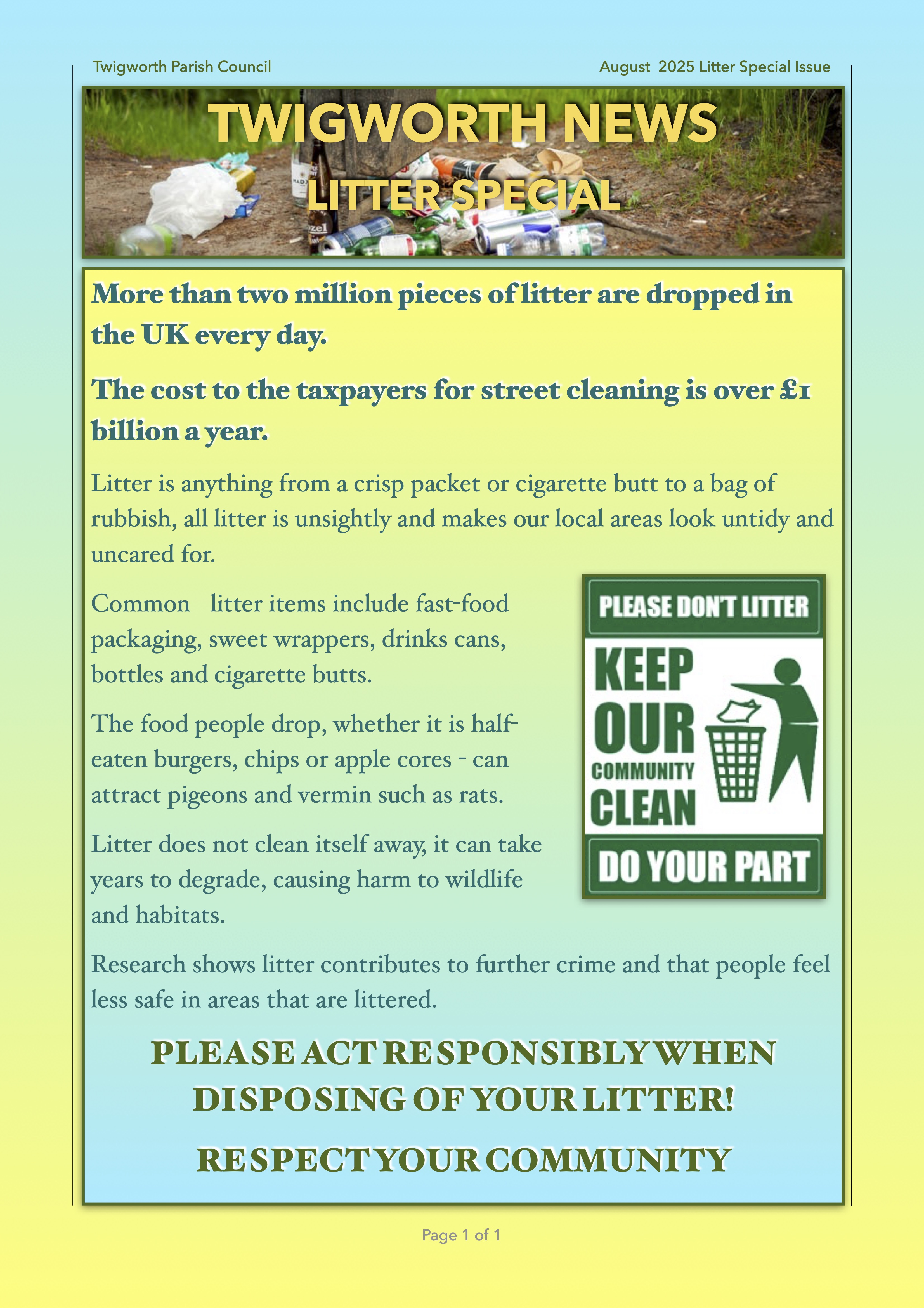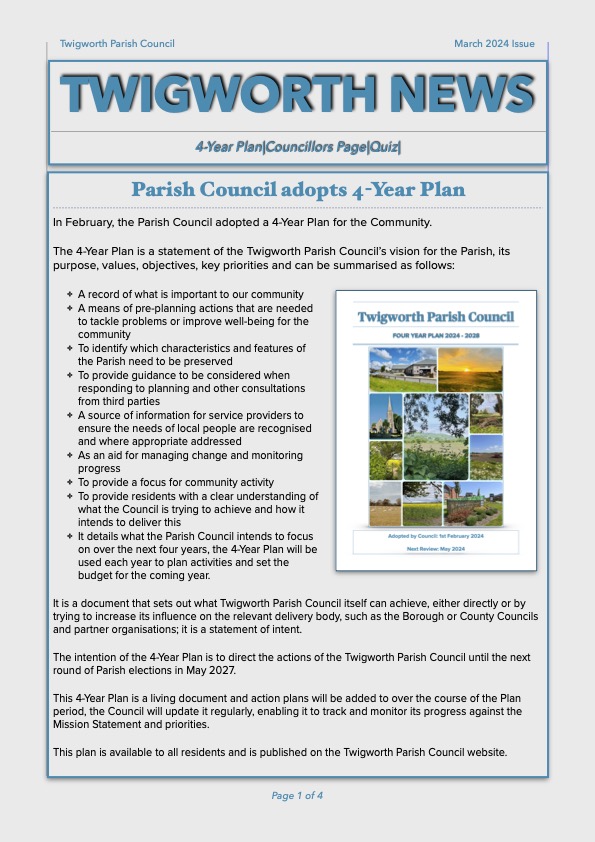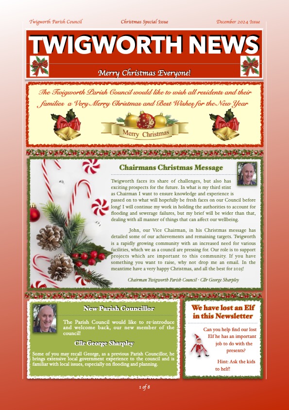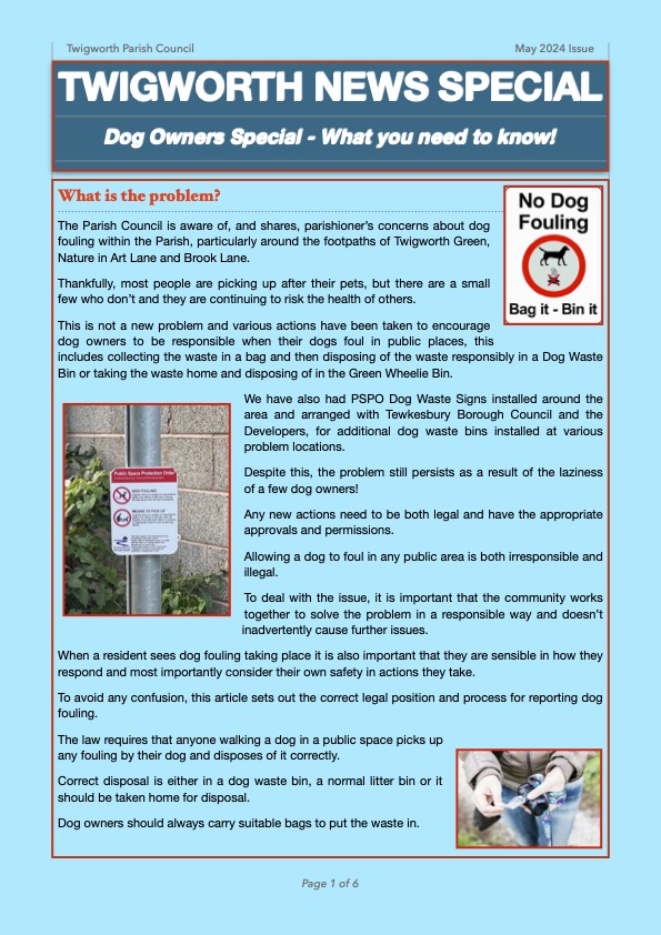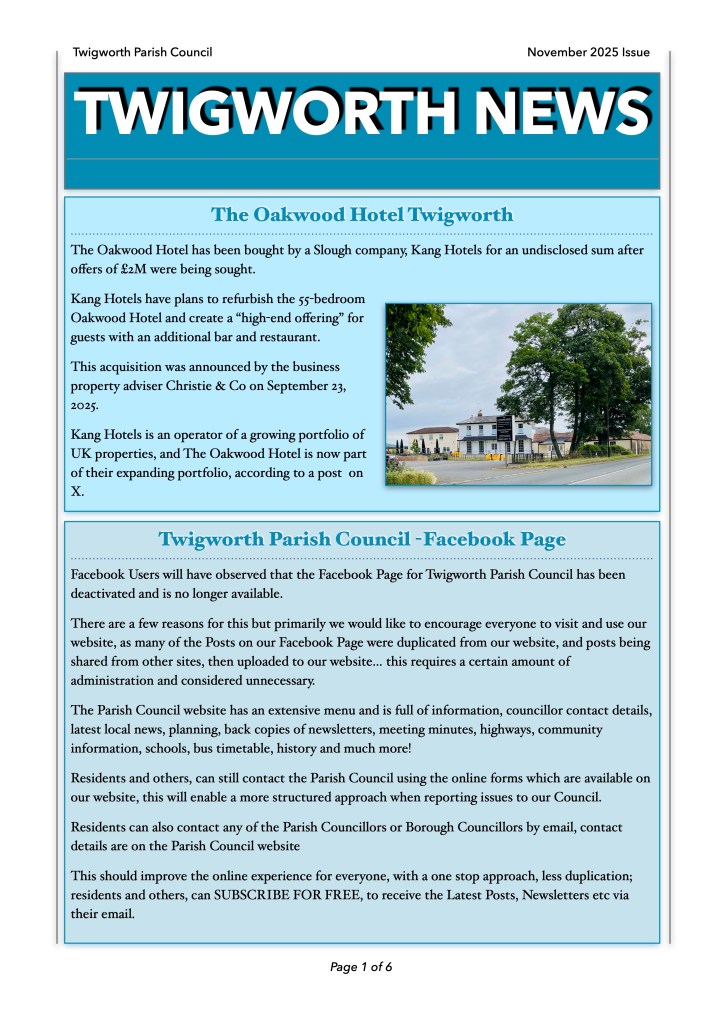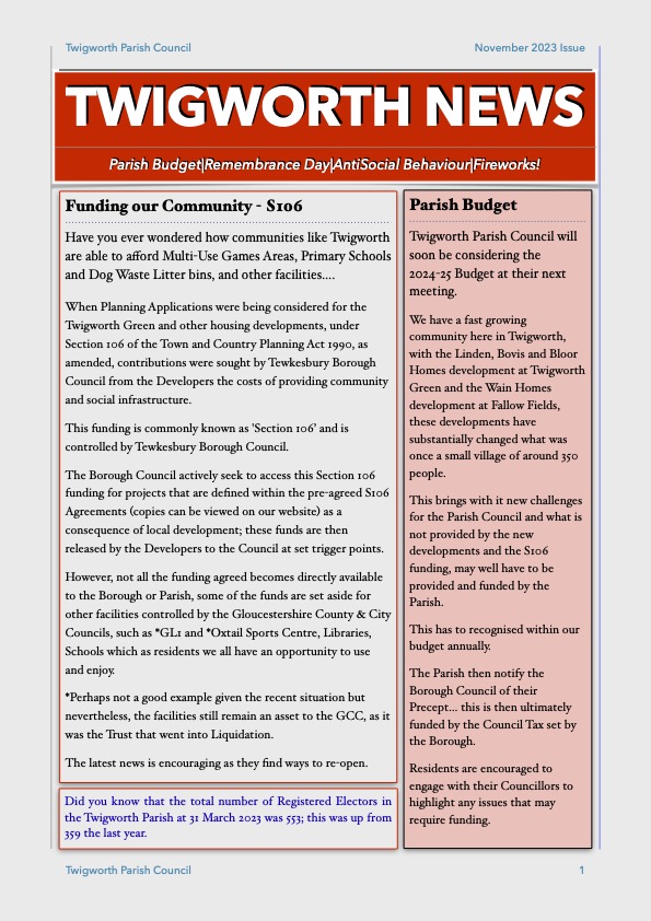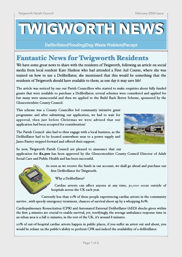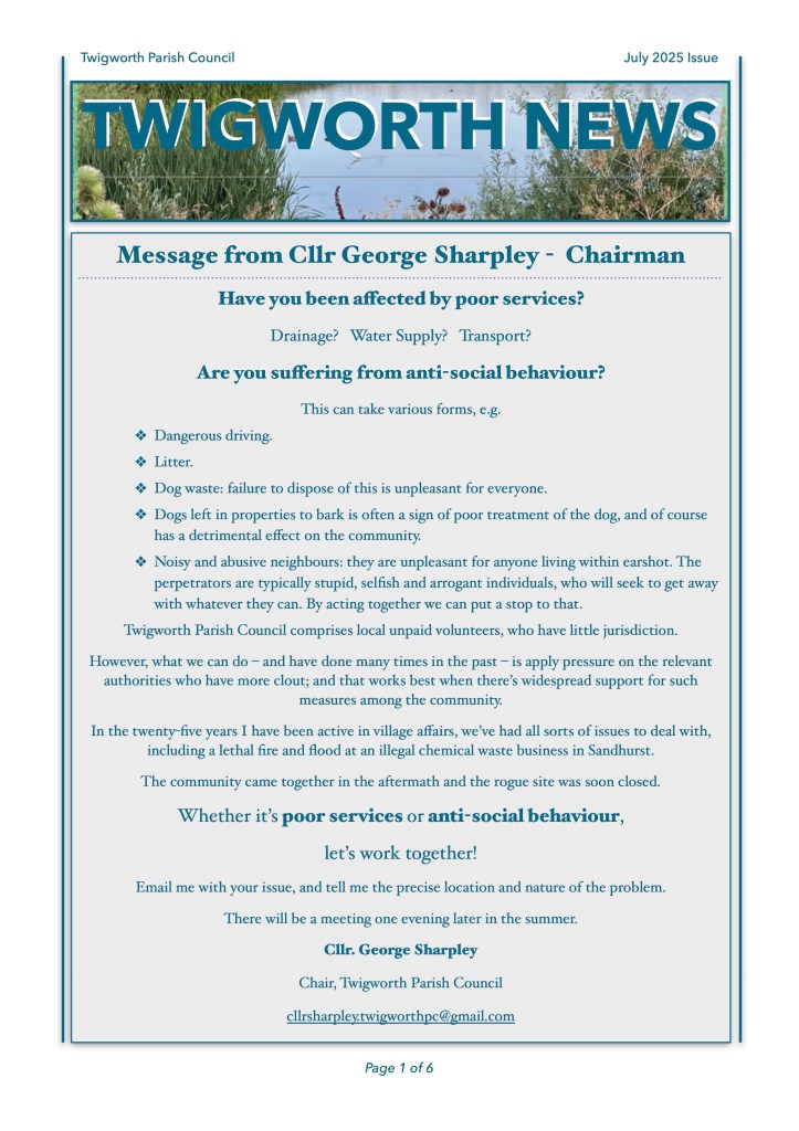 As part of our Community Engagement Policy, the council publishes a monthly newsletter, the Twigworth News, which is published online and on social media.