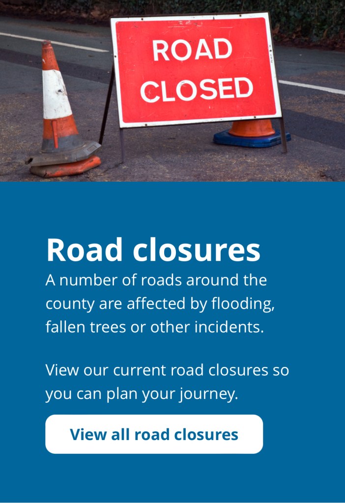 Report an issue to Fix My Street by clicking on the logo – such as potholes; lights, signals and signs; damage to pavement or kerb; road markings and stud issues trees, hedges and vegetation; drainage and flooding; spillages or obstructions on the road; Winter Maintenance – Grit and PROW – public footpaths & bridleways (not pavements).