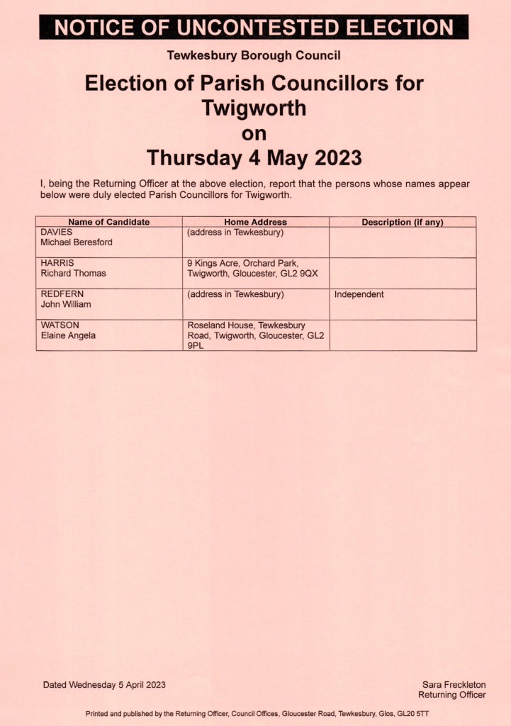 If not displayed here, details of Twigworth Parish Councillors declaration of interests are available from Tewkesbury Borough Council’s Monitoring Officer (ROI).